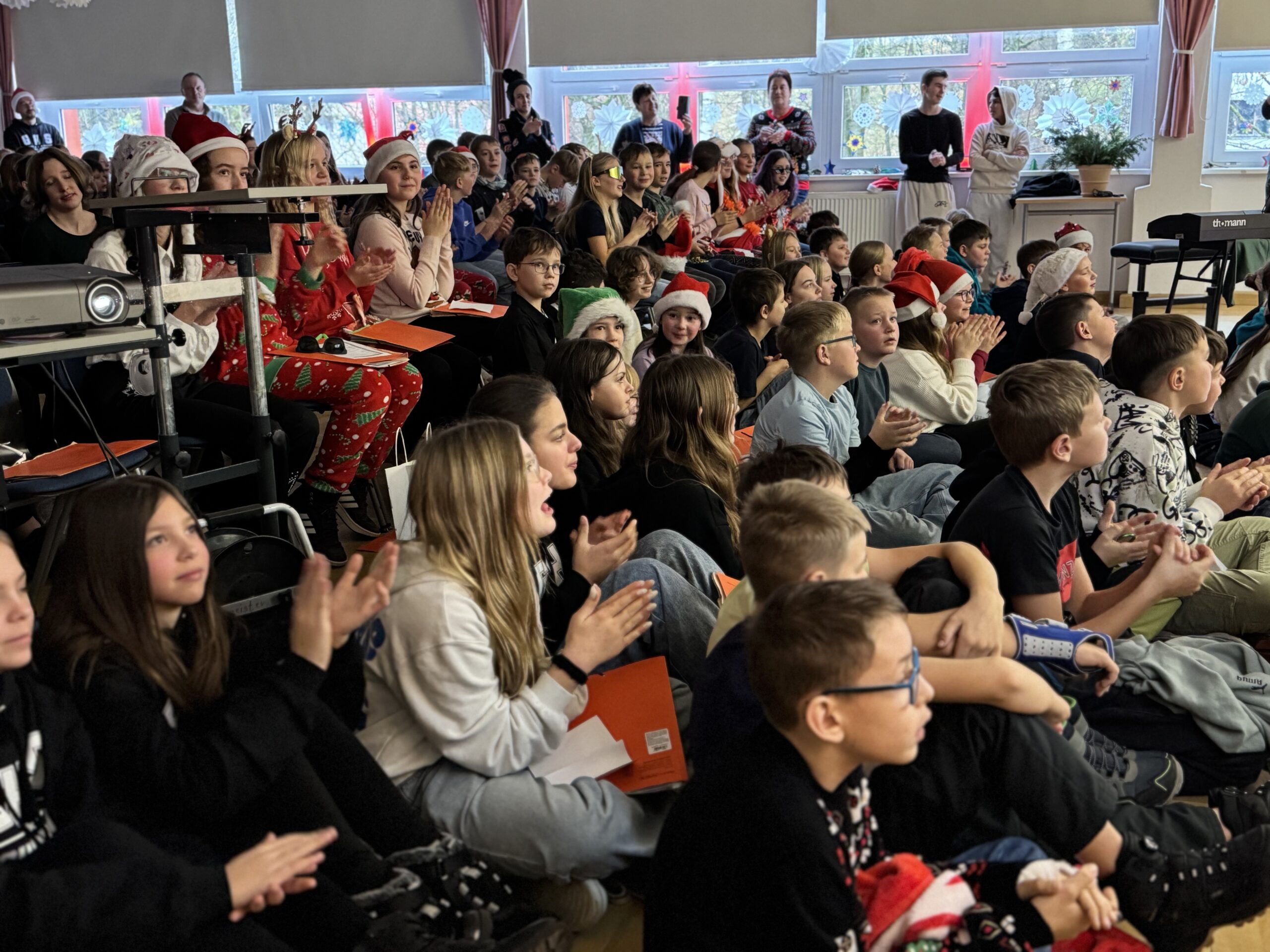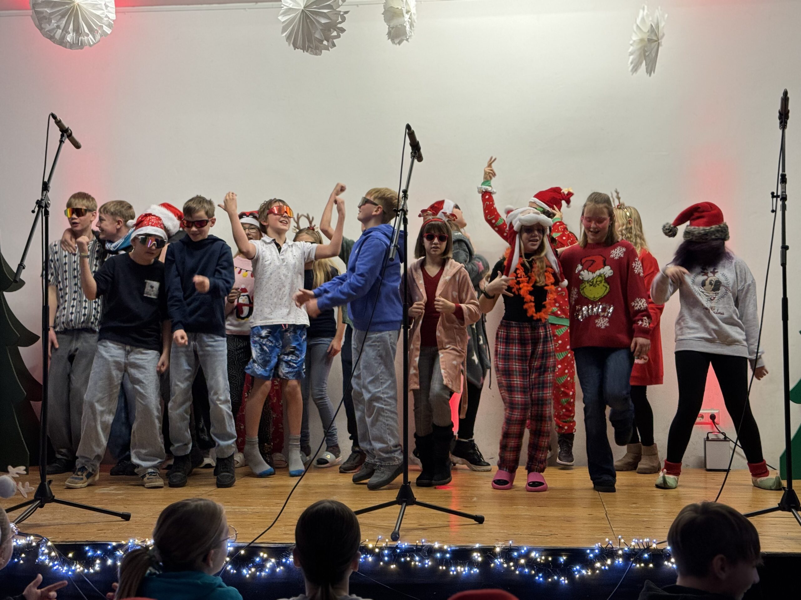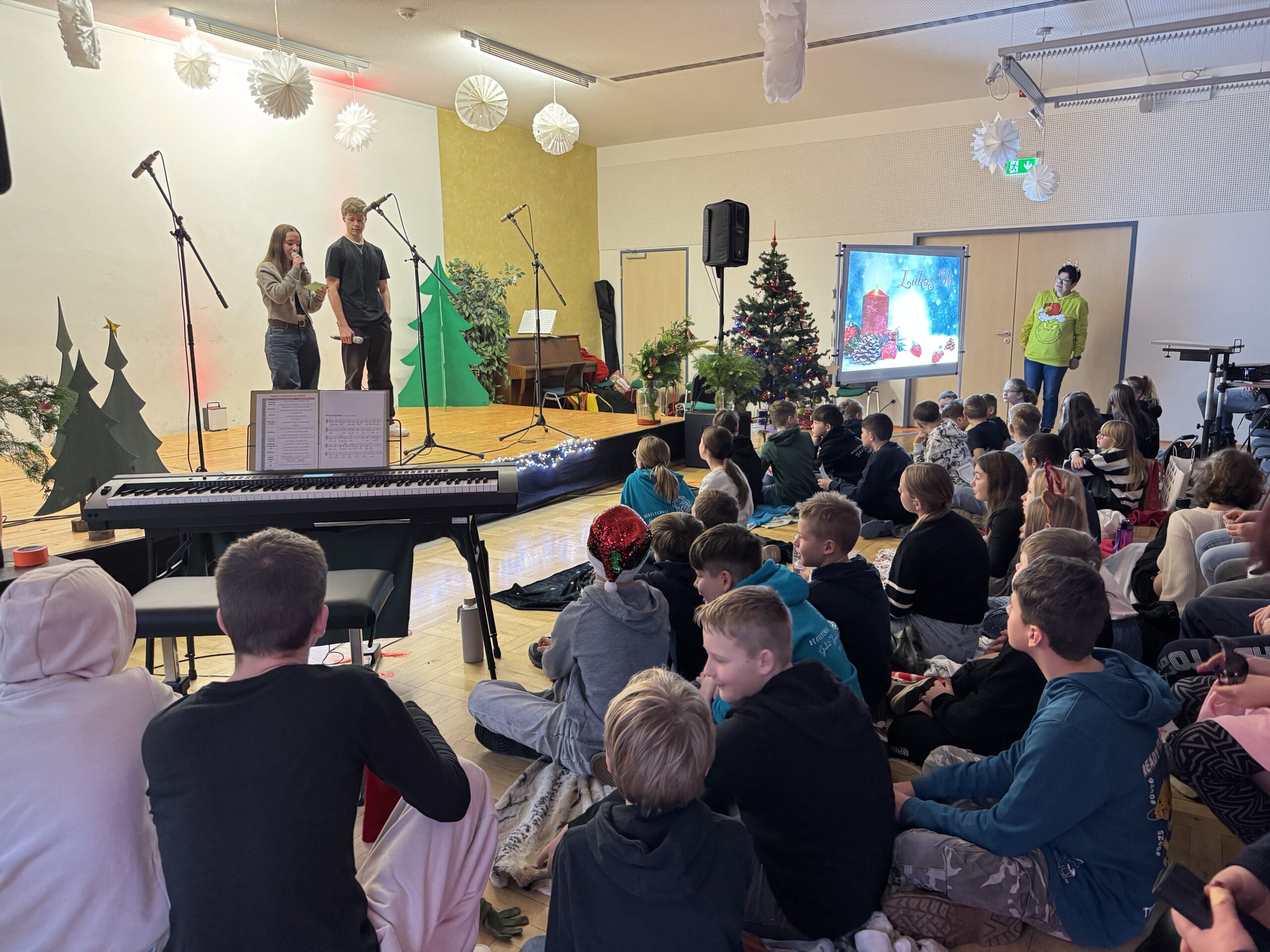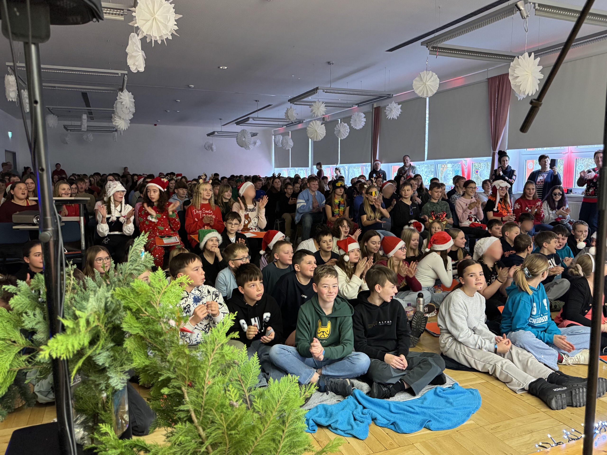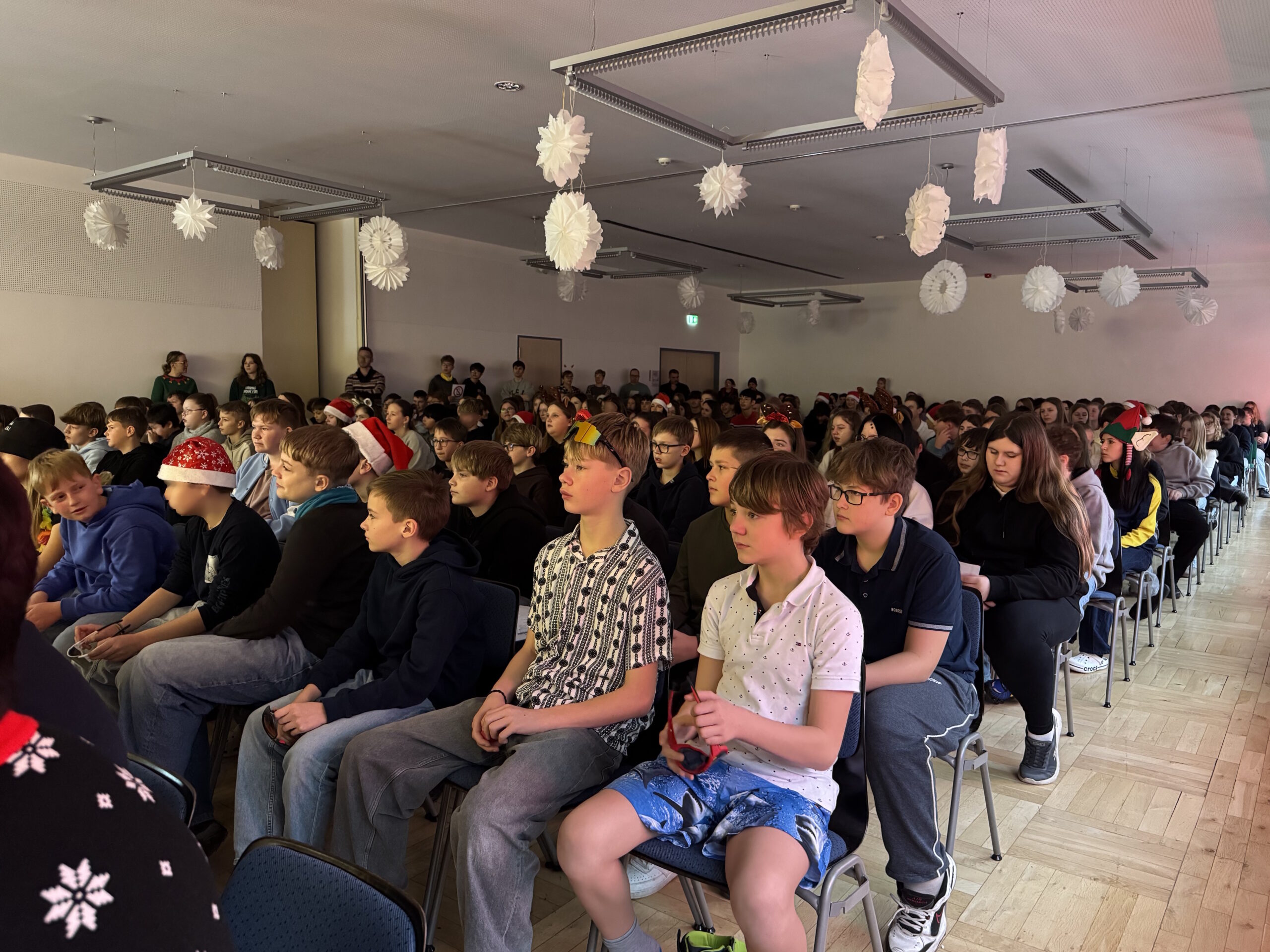 „O du fröhliche Gerhart-Hauptmann-Schule“ – unter dieses Motto hätte man wohl das abwechslungsreiche Weihnachtsprogramm vom letzten Schultag vor den Weihnachtsferien, dem 19. Dezember 2025 stellen können. Unser Musiklehrer und selbsternannter Konzertmeister Herr Kranzl hat wieder ein großartiges Programm auf die Beine gestellt. Eröffnet wurde dies durch Lukas Heß aus der Klasse 5b mit einem Trompetensolo. Die folgende Stunde war gefüllt mit abwechslungsreichen Darbietungen der Klasse 6a mit einem Tanz und Flachwitz-Sketches, mit einer Tanzeinlage der Klasse 6b, mit Liedern des Akkordeonquartetts aus Schülern der 6. und 7. Klassen, mit dem seit diesem Schuljahr vergrößerten Schulchor, mit einem lustigen Gedicht von Anna Heß und Finn Heßler – unterstützt durch Franz Frischmuth (10a) und als Überraschung und kleines Highlight mit dem Klassiker „Last Christmas“ – performt durch Herrn Kranzl und Herrn Langbein. Durch das Programm führten gekonnt die Moderatoren Alia Truckenbrodt und Franz Matern (10b).