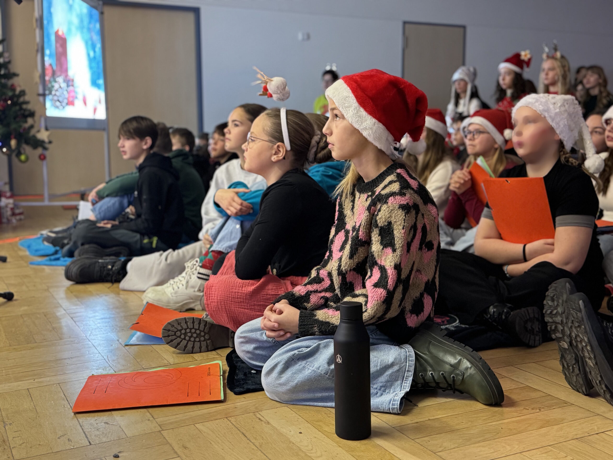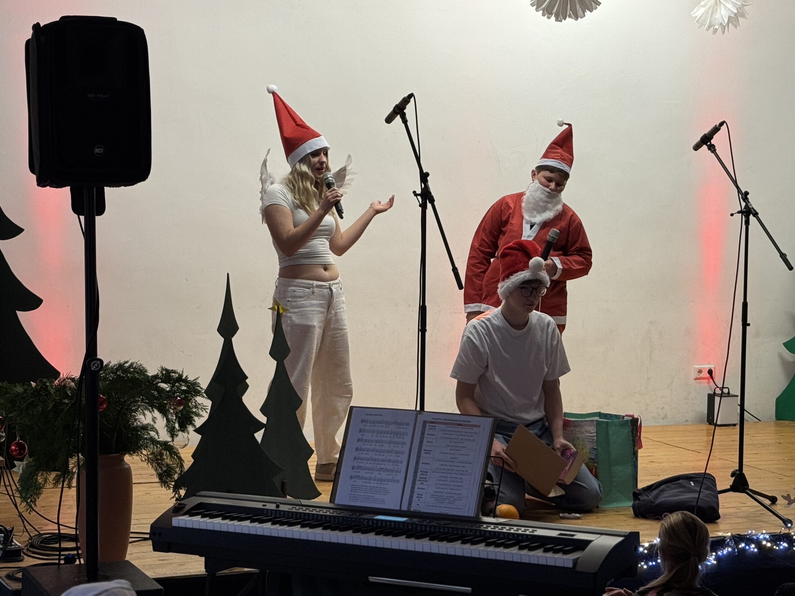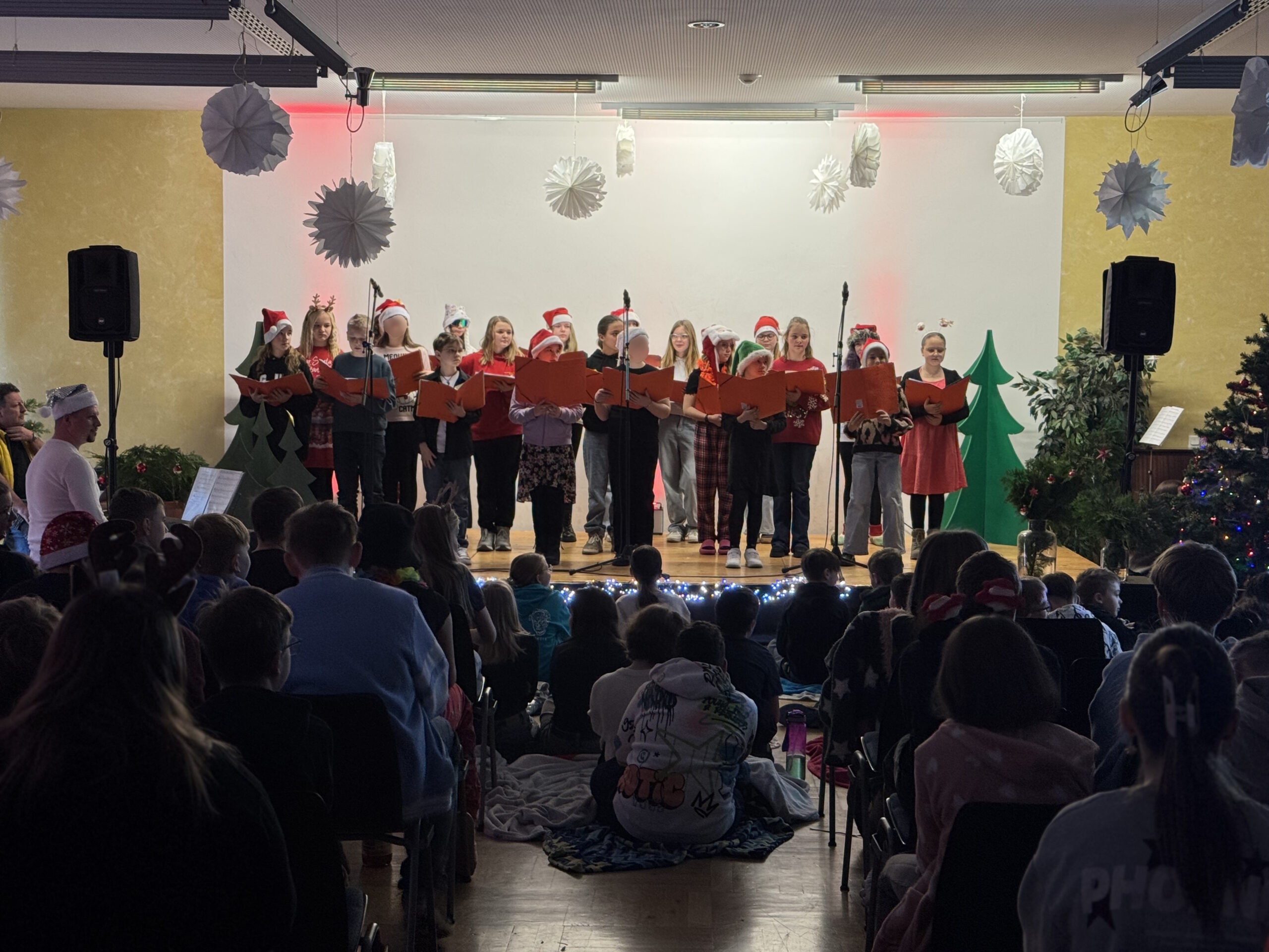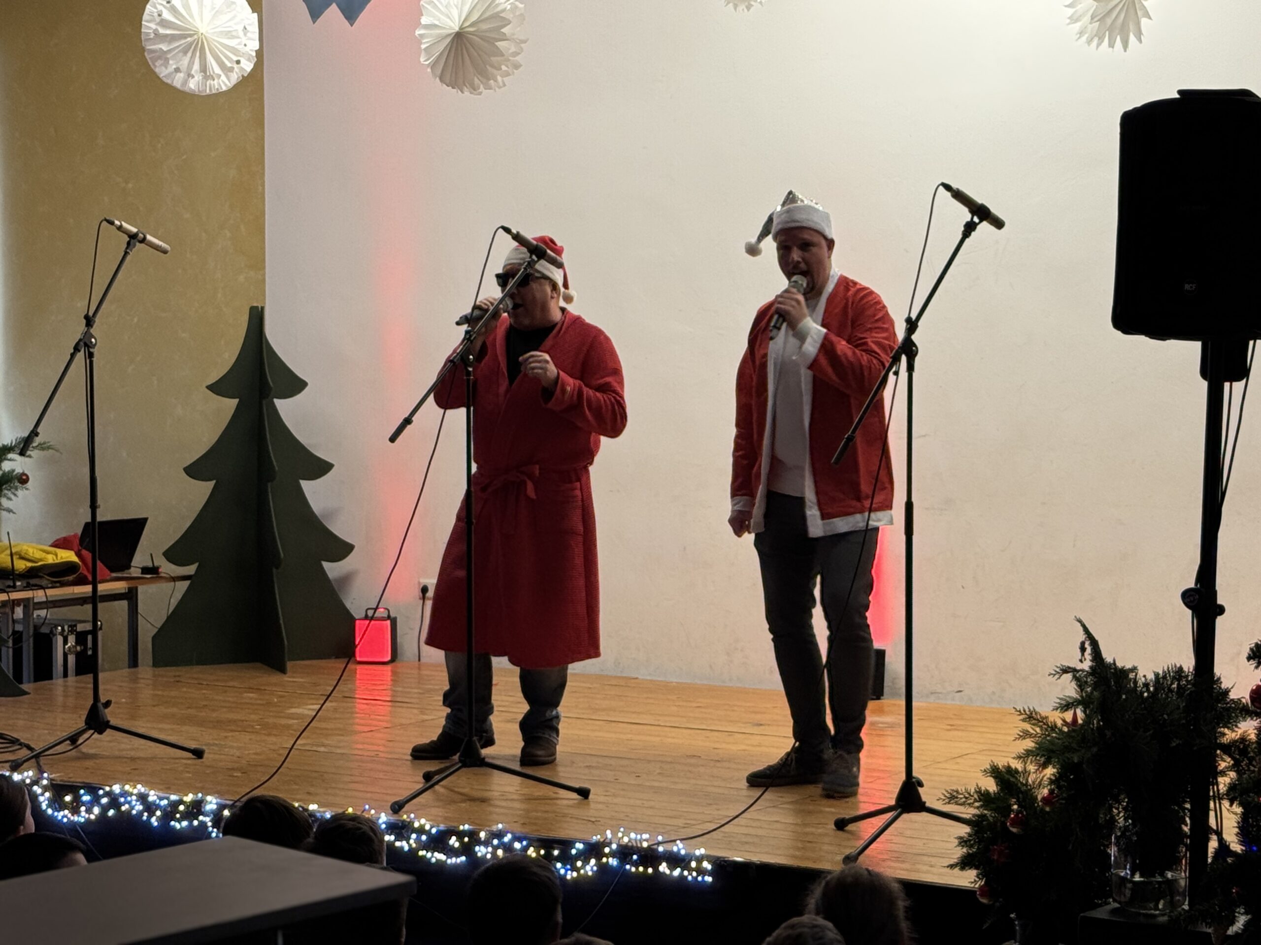„O du fröhliche Gerhart-Hauptmann-Schule“ – unter dieses Motto hätte man wohl das abwechslungsreiche Weihnachtsprogramm vom letzten Schultag vor den Weihnachtsferien, dem 19. Dezember 2025 stellen können. Unser Musiklehrer und selbsternannter Konzertmeister Herr Kranzl hat wieder ein großartiges Programm auf die Beine gestellt. Eröffnet wurde dies durch Lukas Heß aus der Klasse 5b mit einem Trompetensolo. Die folgende Stunde war gefüllt mit abwechslungsreichen Darbietungen der Klasse 6a mit einem Tanz und Flachwitz-Sketches, mit einer Tanzeinlage der Klasse 6b, mit Liedern des Akkordeonquartetts aus Schülern der 6. und 7. Klassen, mit dem seit diesem Schuljahr vergrößerten Schulchor, mit einem lustigen Gedicht von Anna Heß und Finn Heßler – unterstützt durch Franz Frischmuth (10a) und als Überraschung und kleines Highlight mit dem Klassiker „Last Christmas“ – performt durch Herrn Kranzl und Herrn Langbein. Durch das Programm führten gekonnt die Moderatoren Alia Truckenbrodt und Franz Matern (10b).