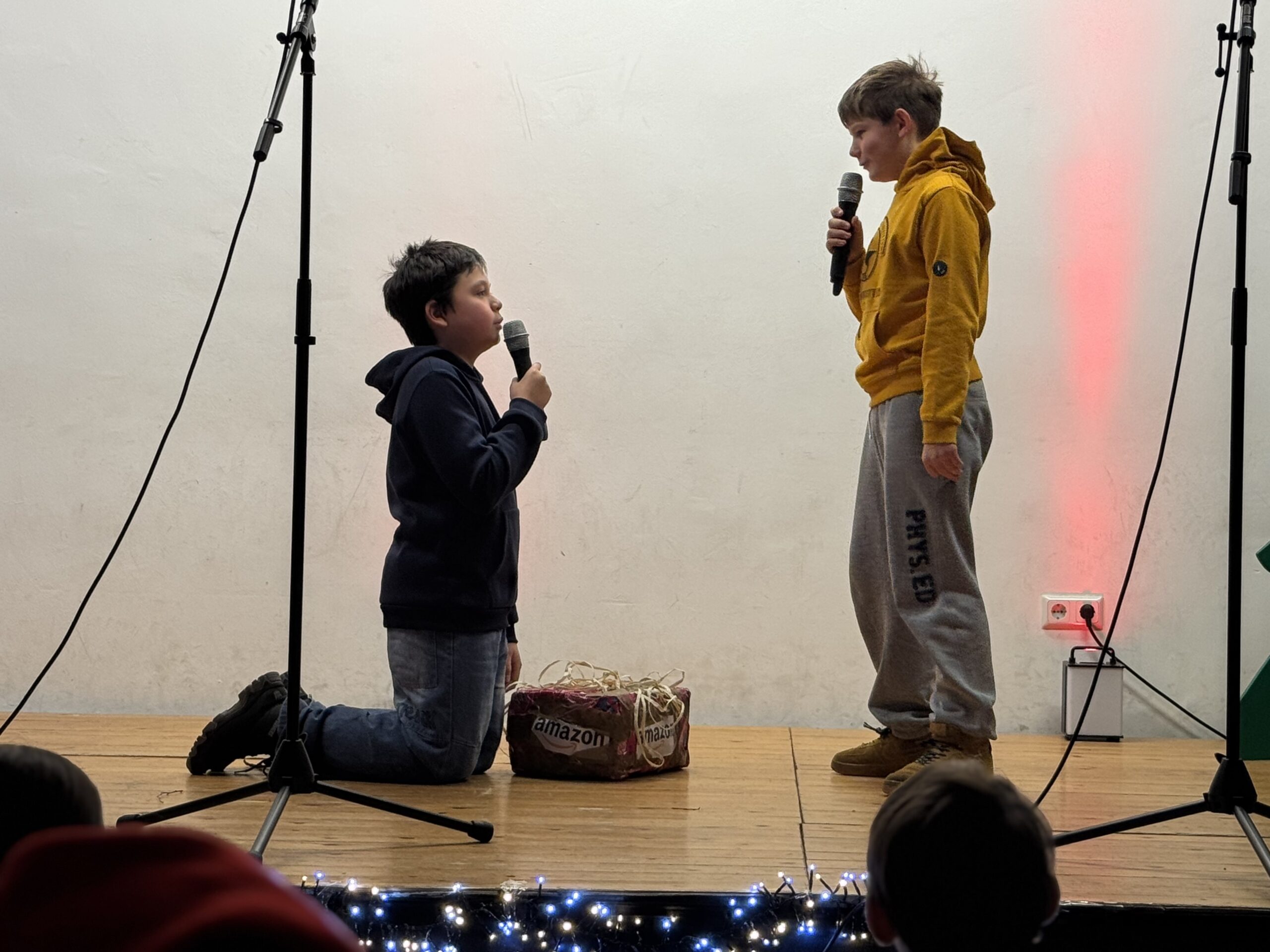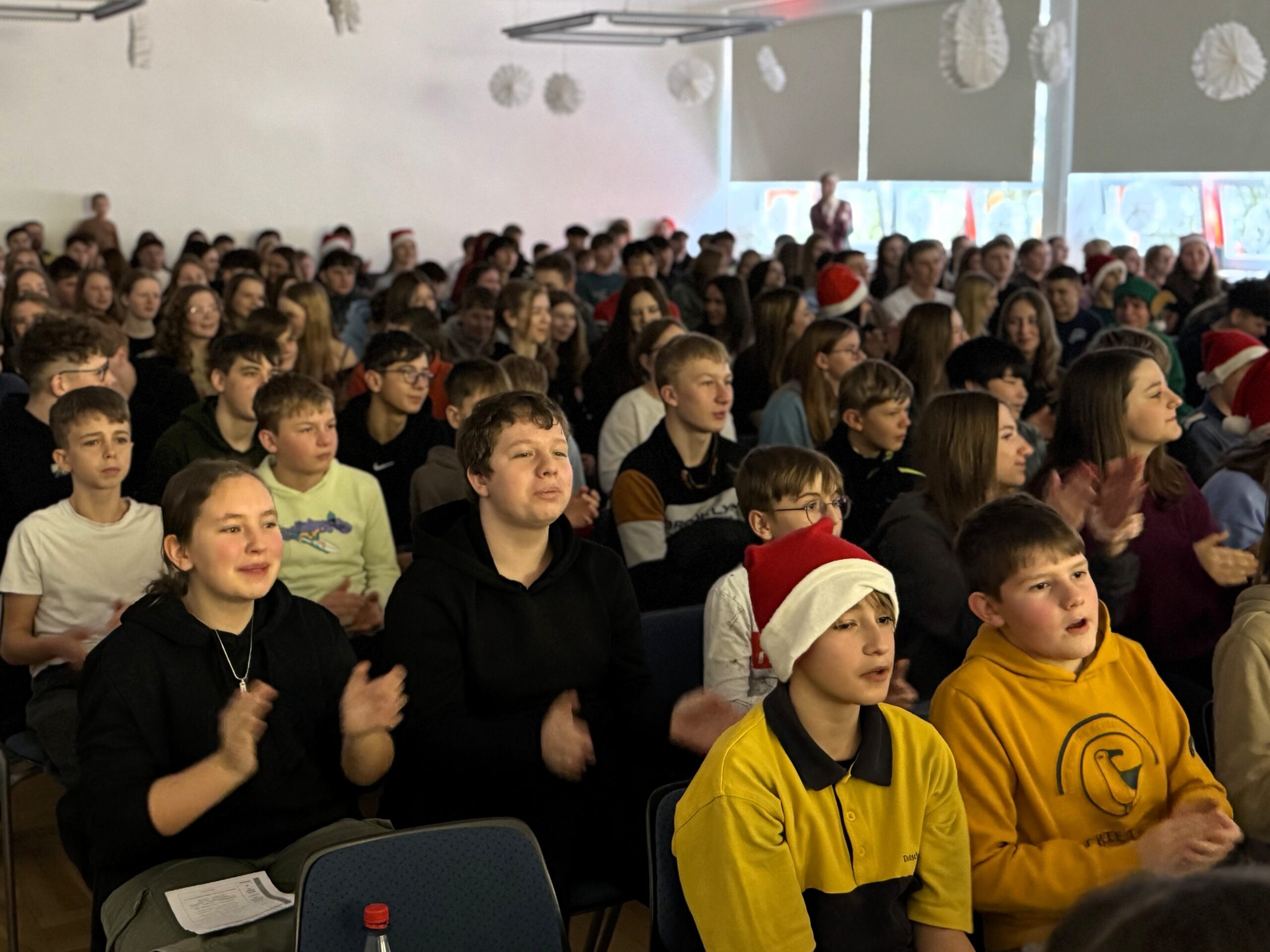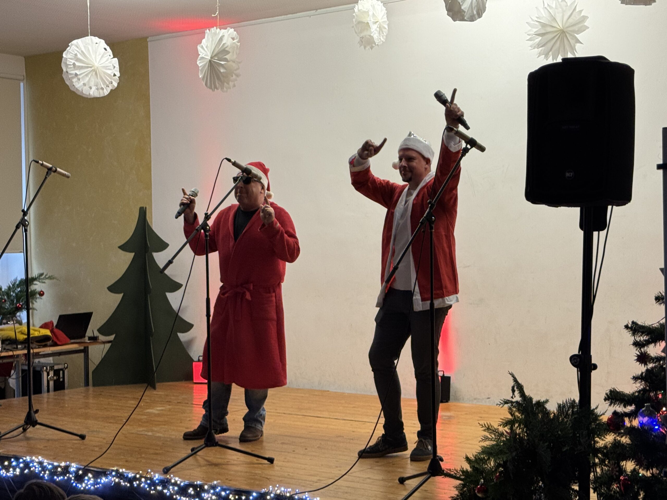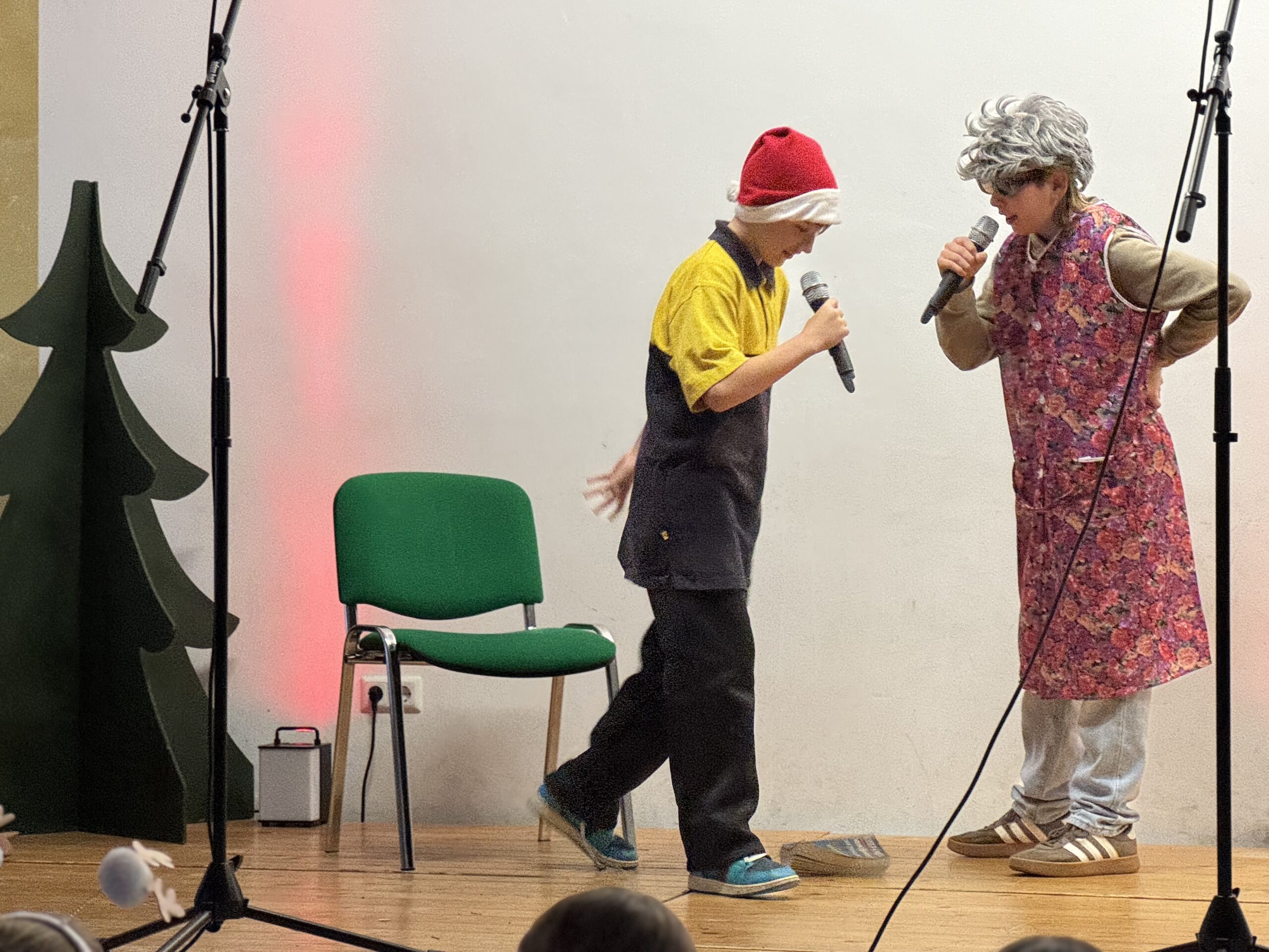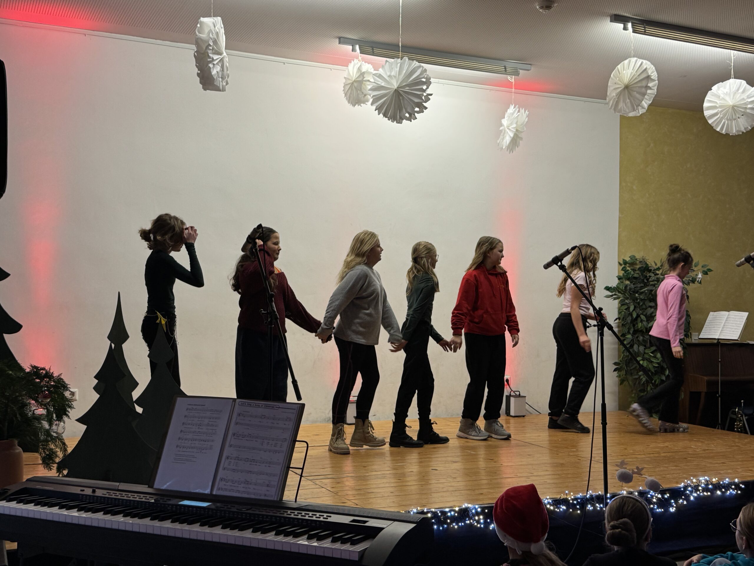 „O du fröhliche Gerhart-Hauptmann-Schule“ – unter dieses Motto hätte man wohl das abwechslungsreiche Weihnachtsprogramm vom letzten Schultag vor den Weihnachtsferien, dem 19. Dezember 2025 stellen können. Unser Musiklehrer und selbsternannter Konzertmeister Herr Kranzl hat wieder ein großartiges Programm auf die Beine gestellt. Eröffnet wurde dies durch Lukas Heß aus der Klasse 5b mit einem Trompetensolo. Die folgende Stunde war gefüllt mit abwechslungsreichen Darbietungen der Klasse 6a mit einem Tanz und Flachwitz-Sketches, mit einer Tanzeinlage der Klasse 6b, mit Liedern des Akkordeonquartetts aus Schülern der 6. und 7. Klassen, mit dem seit diesem Schuljahr vergrößerten Schulchor, mit einem lustigen Gedicht von Anna Heß und Finn Heßler – unterstützt durch Franz Frischmuth (10a) und als Überraschung und kleines Highlight mit dem Klassiker „Last Christmas“ – performt durch Herrn Kranzl und Herrn Langbein. Durch das Programm führten gekonnt die Moderatoren Alia Truckenbrodt und Franz Matern (10b).