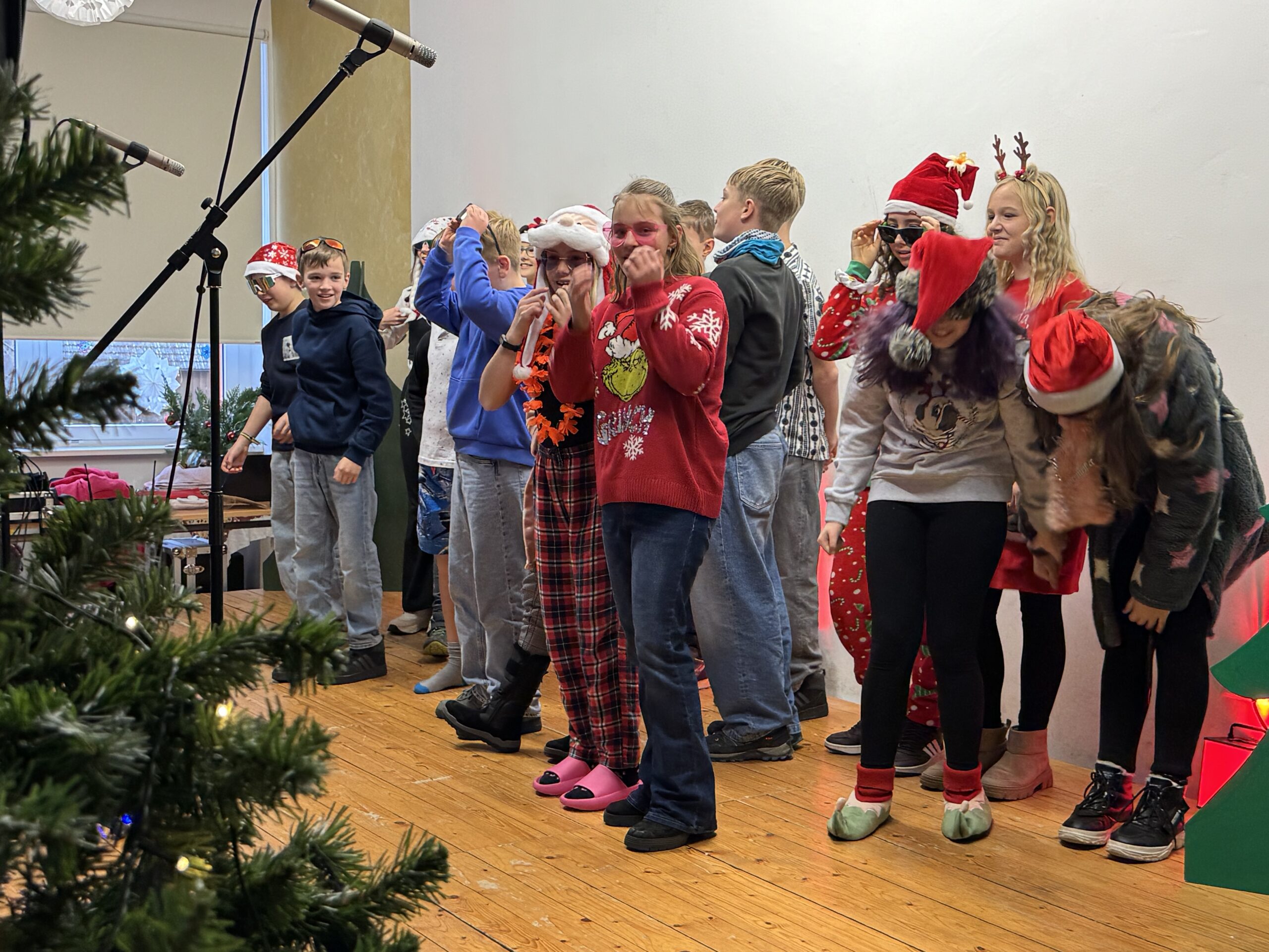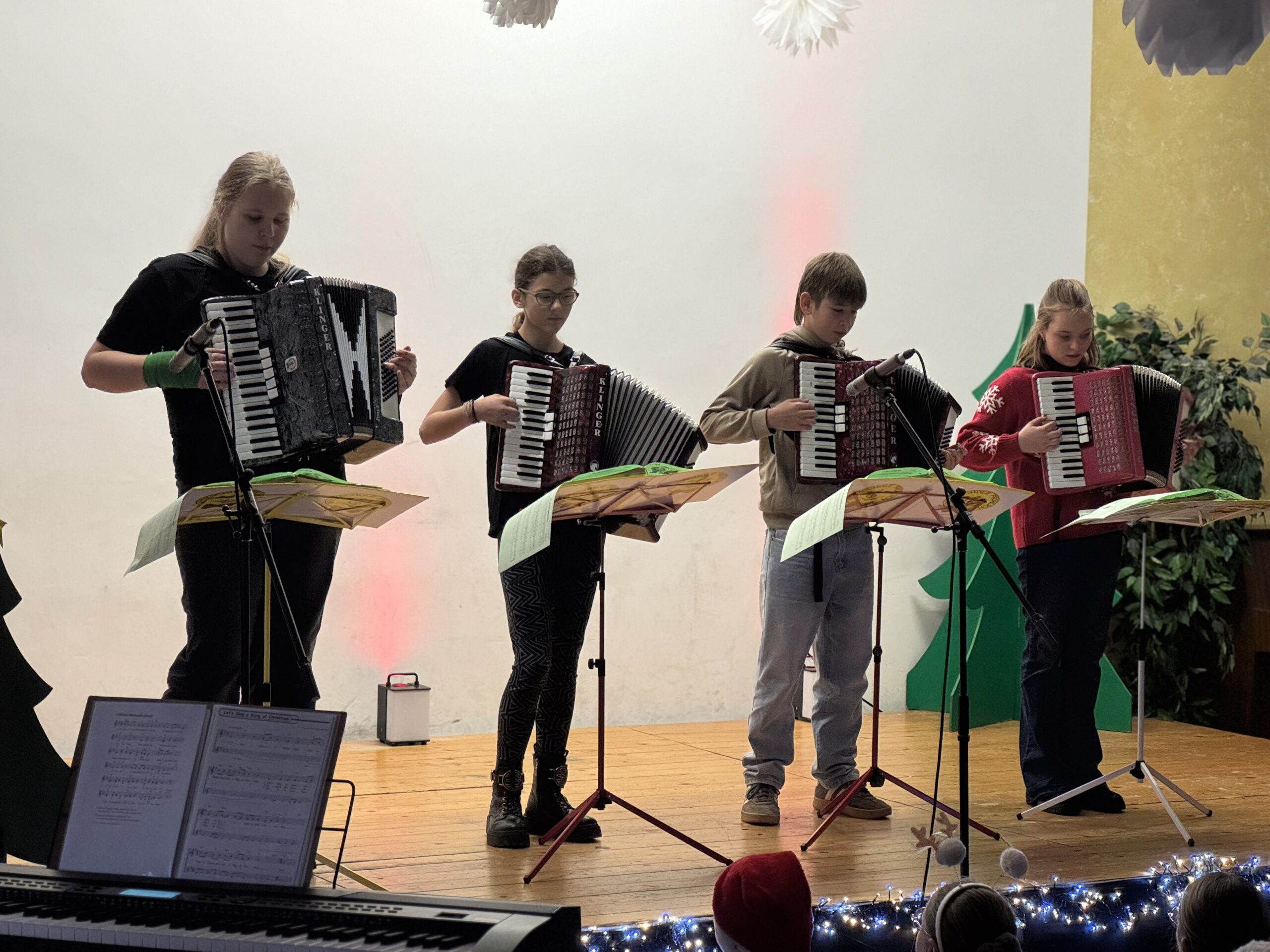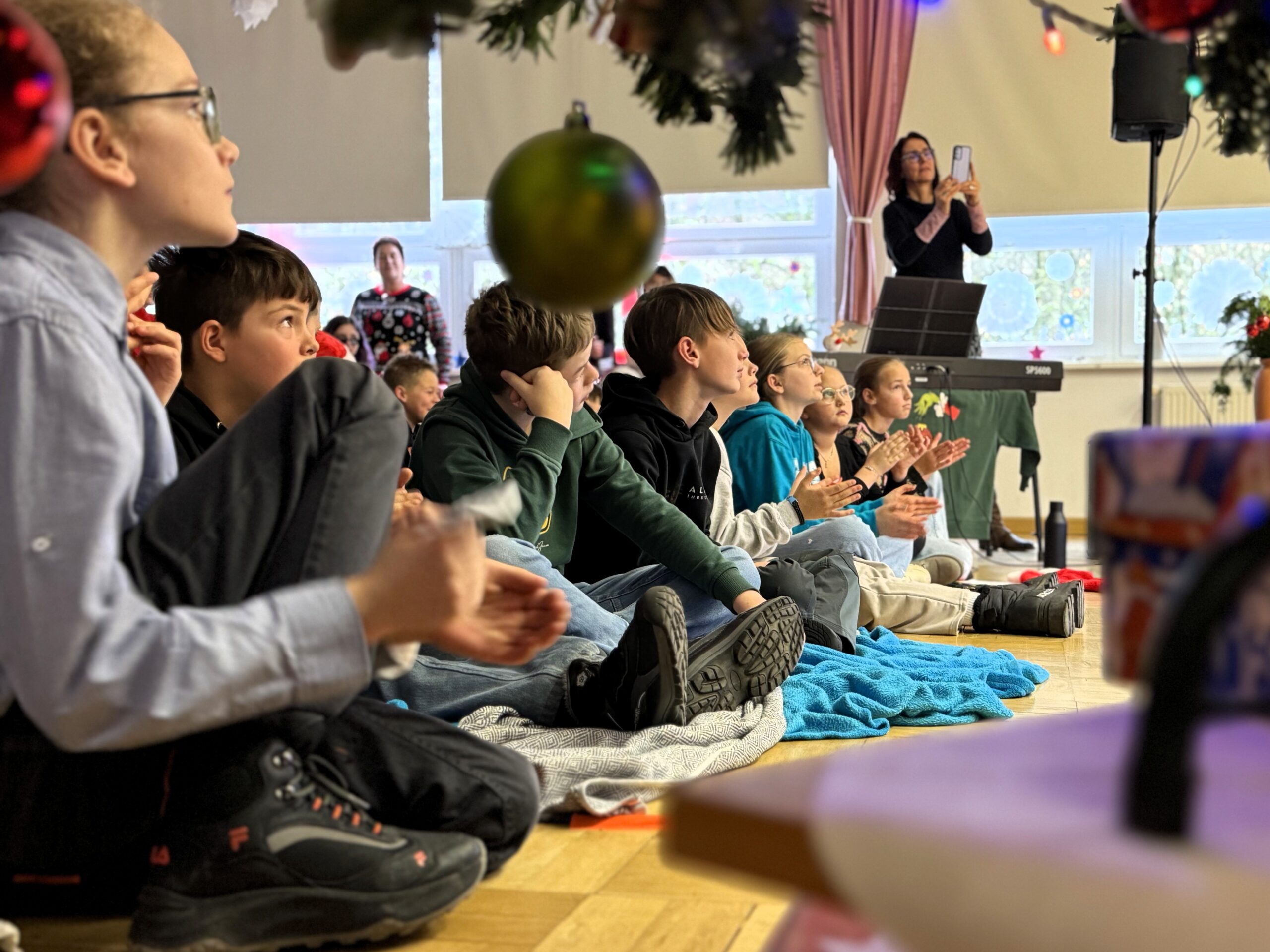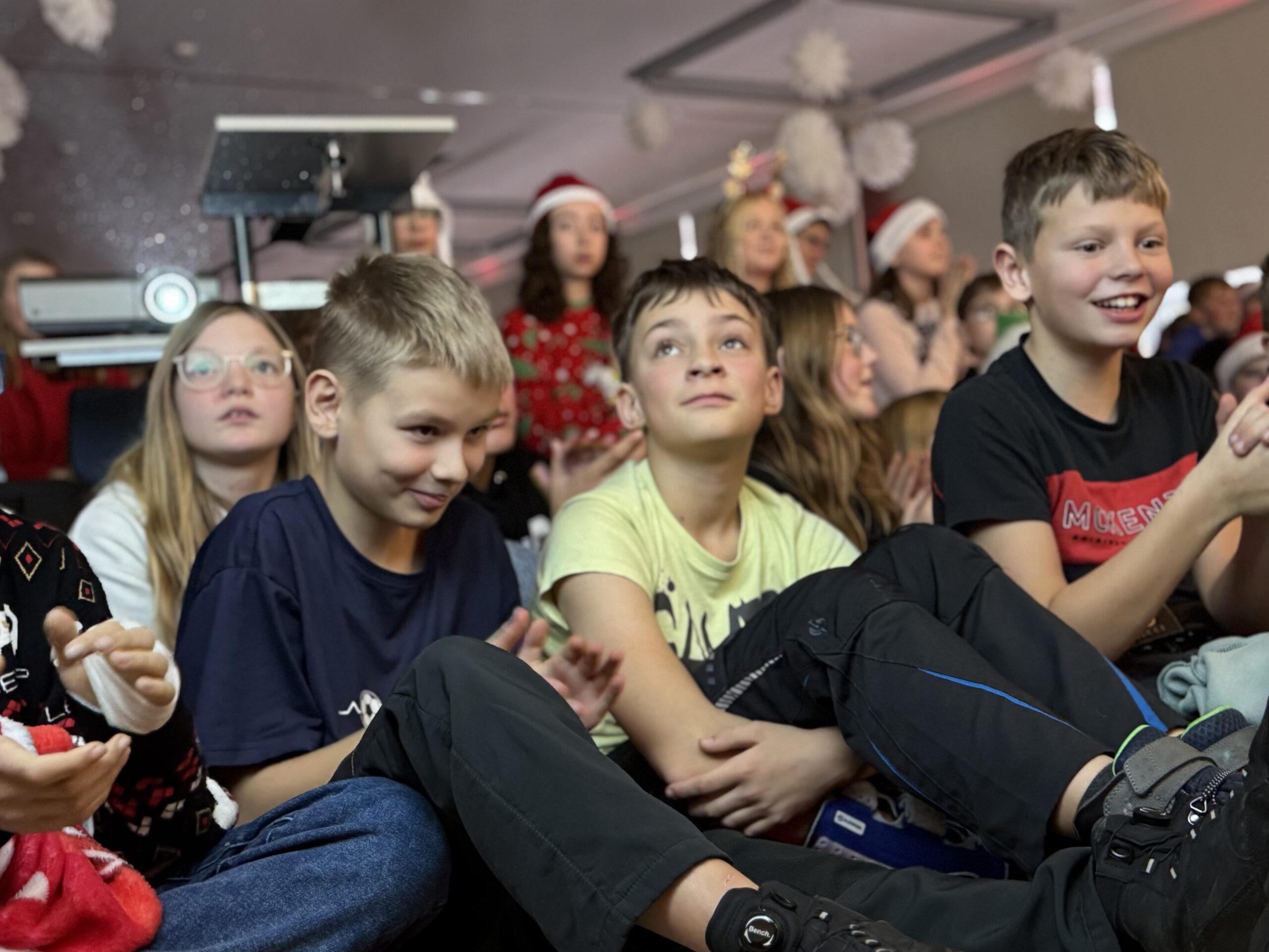 „O du fröhliche Gerhart-Hauptmann-Schule“ – unter dieses Motto hätte man wohl das abwechslungsreiche Weihnachtsprogramm vom letzten Schultag vor den Weihnachtsferien, dem 19. Dezember 2025 stellen können. Unser Musiklehrer und selbsternannter Konzertmeister Herr Kranzl hat wieder ein großartiges Programm auf die Beine gestellt. Eröffnet wurde dies durch Lukas Heß aus der Klasse 5b mit einem Trompetensolo. Die folgende Stunde war gefüllt mit abwechslungsreichen Darbietungen der Klasse 6a mit einem Tanz und Flachwitz-Sketches, mit einer Tanzeinlage der Klasse 6b, mit Liedern des Akkordeonquartetts aus Schülern der 6. und 7. Klassen, mit dem seit diesem Schuljahr vergrößerten Schulchor, mit einem lustigen Gedicht von Anna Heß und Finn Heßler – unterstützt durch Franz Frischmuth (10a) und als Überraschung und kleines Highlight mit dem Klassiker „Last Christmas“ – performt durch Herrn Kranzl und Herrn Langbein. Durch das Programm führten gekonnt die Moderatoren Alia Truckenbrodt und Franz Matern (10b).