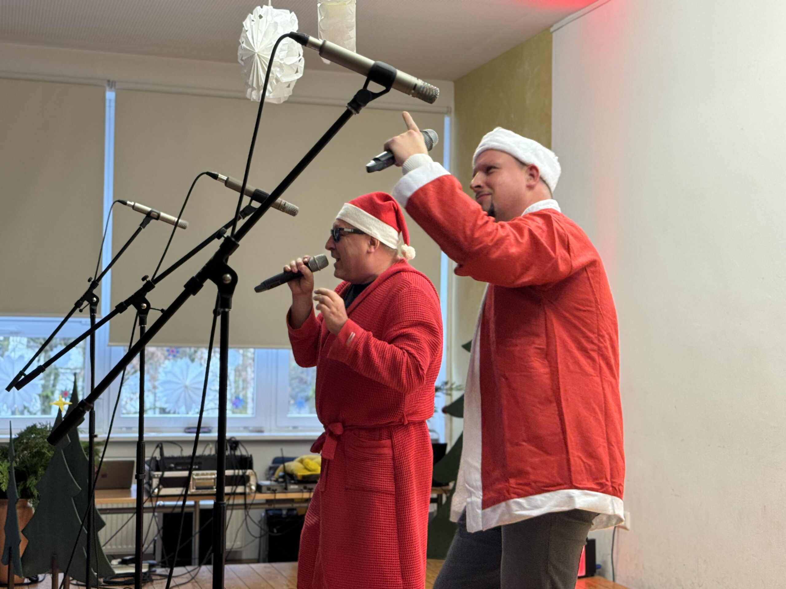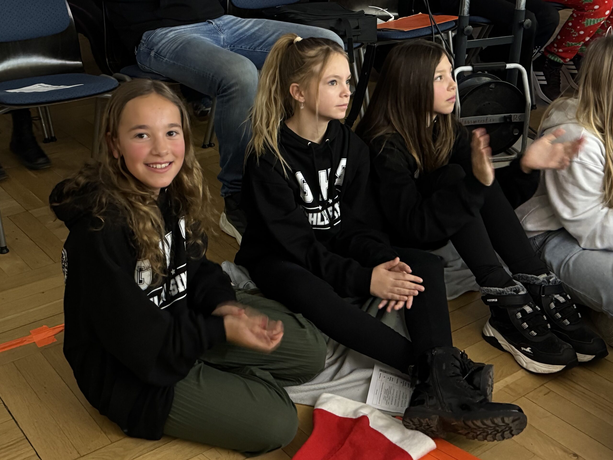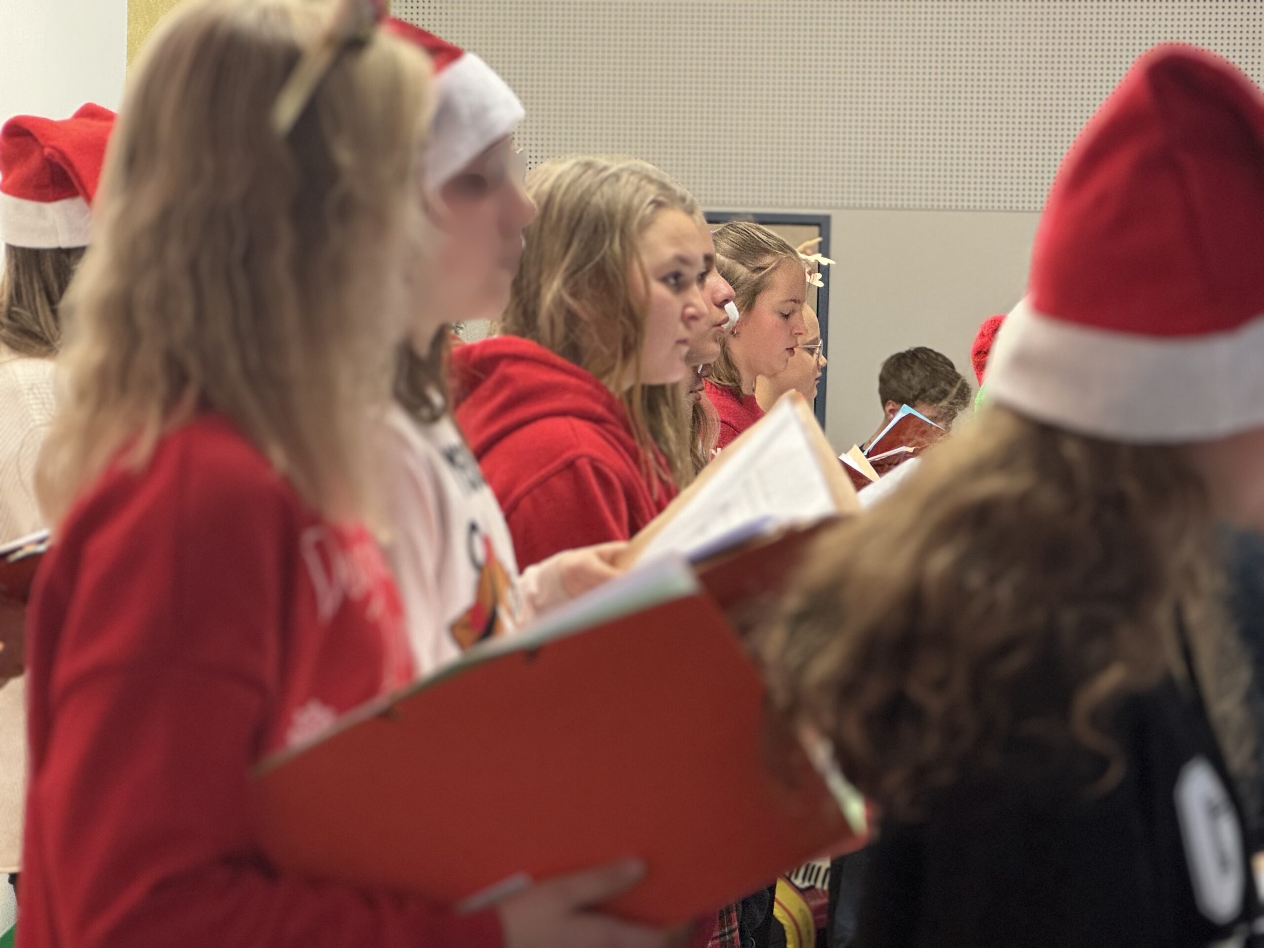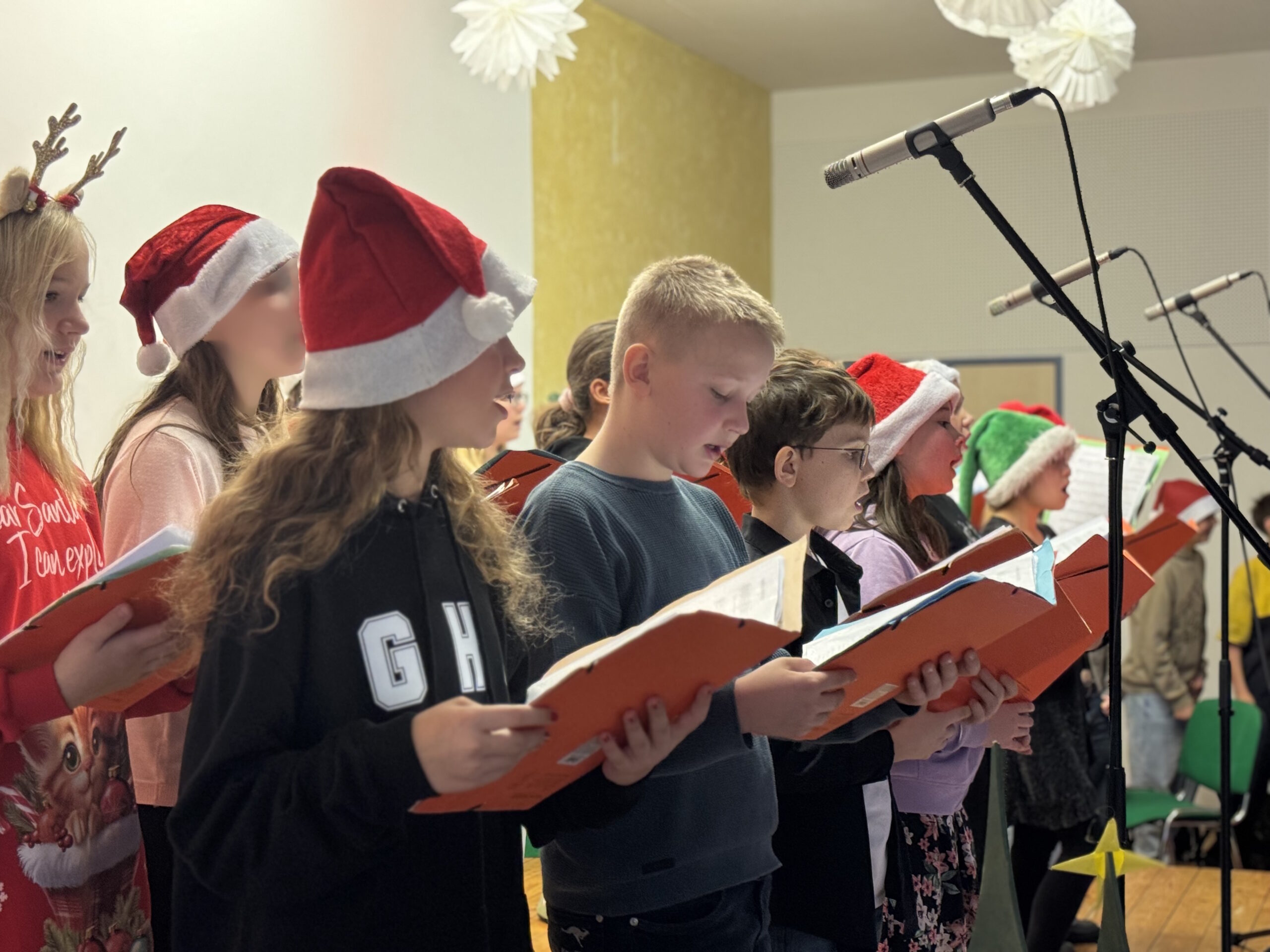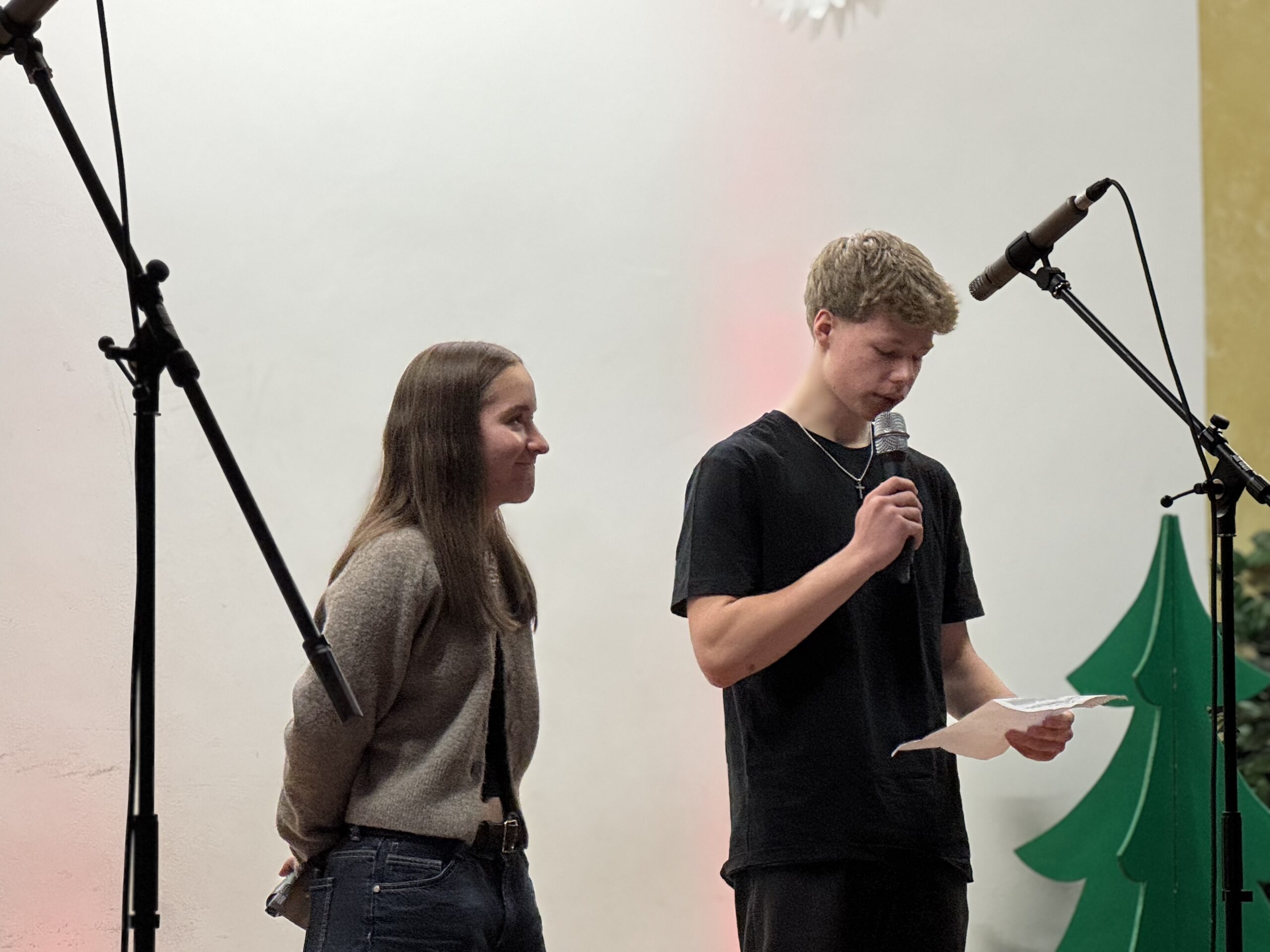 „O du fröhliche Gerhart-Hauptmann-Schule“ – unter dieses Motto hätte man wohl das abwechslungsreiche Weihnachtsprogramm vom letzten Schultag vor den Weihnachtsferien, dem 19. Dezember 2025 stellen können. Unser Musiklehrer und selbsternannter Konzertmeister Herr Kranzl hat wieder ein großartiges Programm auf die Beine gestellt. Eröffnet wurde dies durch Lukas Heß aus der Klasse 5b mit einem Trompetensolo. Die folgende Stunde war gefüllt mit abwechslungsreichen Darbietungen der Klasse 6a mit einem Tanz und Flachwitz-Sketches, mit einer Tanzeinlage der Klasse 6b, mit Liedern des Akkordeonquartetts aus Schülern der 6. und 7. Klassen, mit dem seit diesem Schuljahr vergrößerten Schulchor, mit einem lustigen Gedicht von Anna Heß und Finn Heßler – unterstützt durch Franz Frischmuth (10a) und als Überraschung und kleines Highlight mit dem Klassiker „Last Christmas“ – performt durch Herrn Kranzl und Herrn Langbein. Durch das Programm führten gekonnt die Moderatoren Alia Truckenbrodt und Franz Matern (10b).